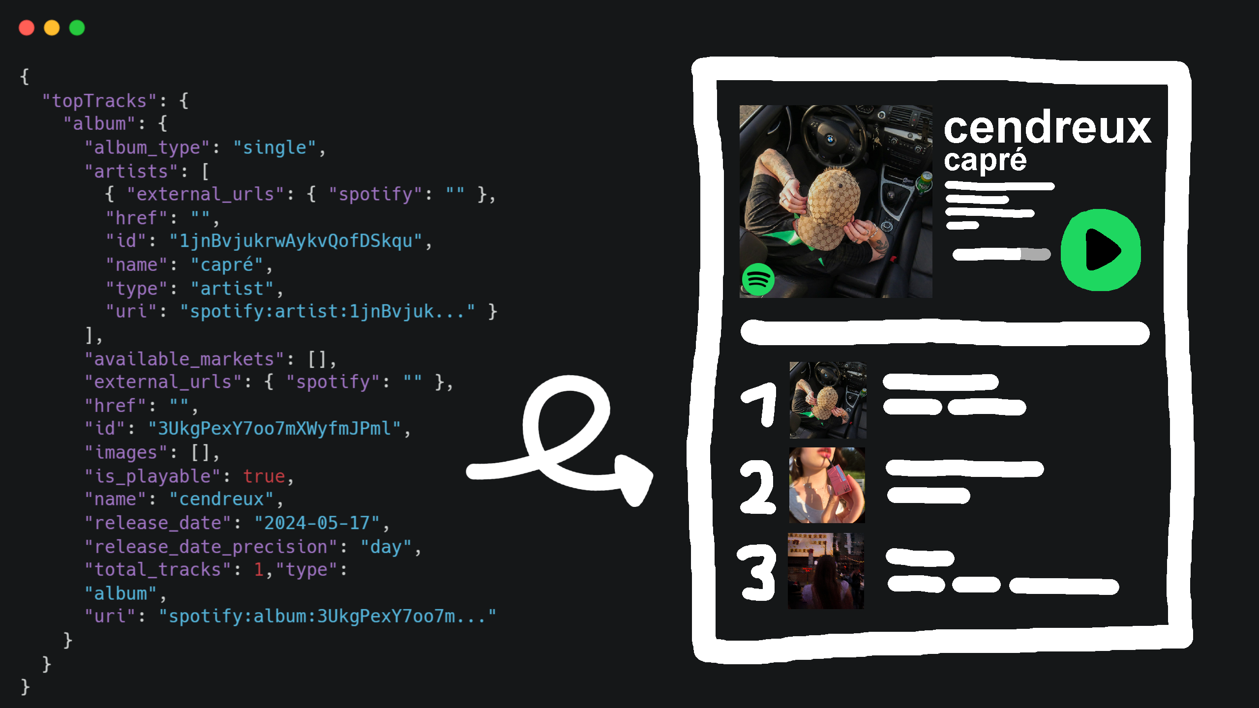 netlify deploy --prodto push everything to Netlify (if you change anything run it again). Now the JSON will be served on something likehttps://your-project.netlify.app/.netlify/functions/get-spotify-datawhich you can use later for displaying the content.